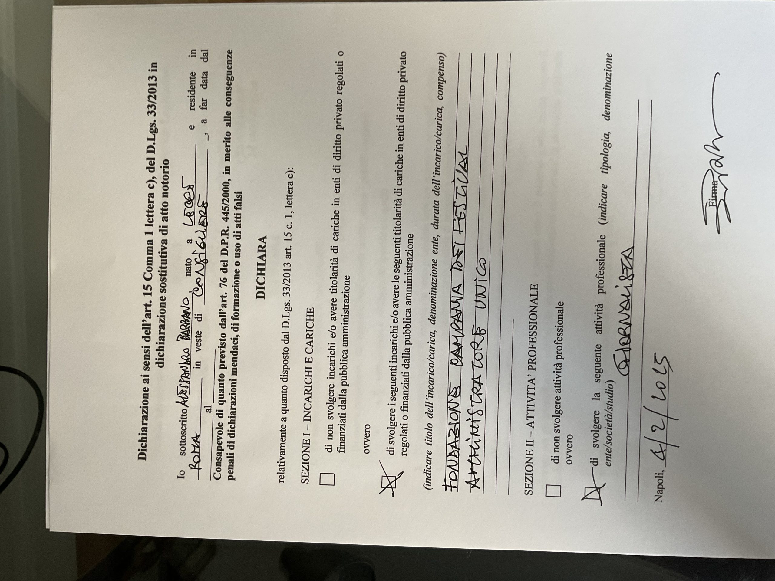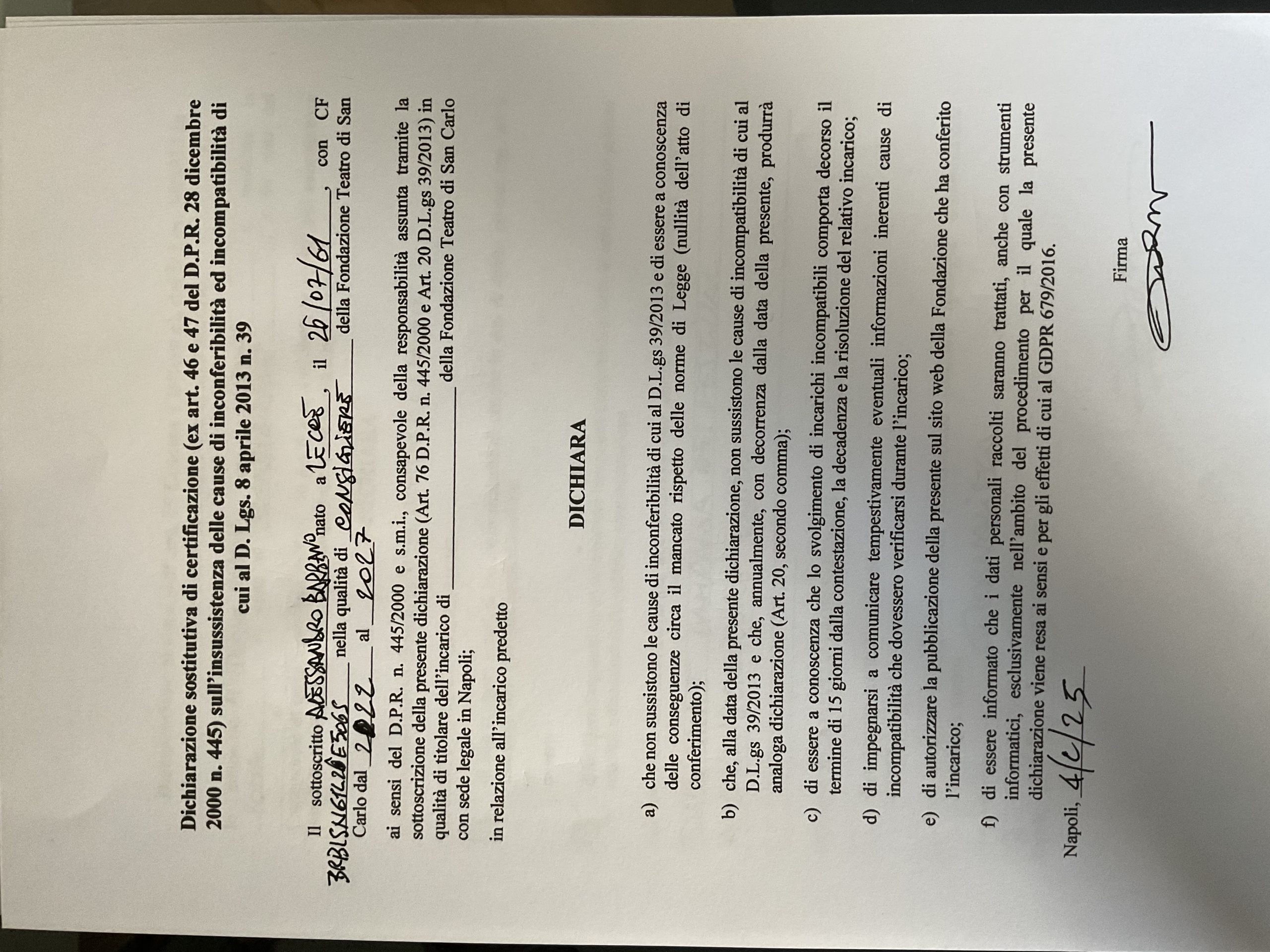 (Ai sensi del D.Lgs. 367/1996 e di Statuto, il Presidente è il sindaco della città ove ha sede la Fondazione, salvo facoltà di nominare per la carica altro soggetto da lui individuato. Si segnala che il certificato di pubblicazione all’albo pretorio del provvedimento “Convalida del Sindaco e dei consiglieri comunali (art.41 comma 1 D.Lgs 267/2000) e tutti gli ulteriori documenti richiesti dalla normativa in vigore sono disponibili sul sito istituzionale del Comune di Napoli , sezione Amministrazione Trasparente.)